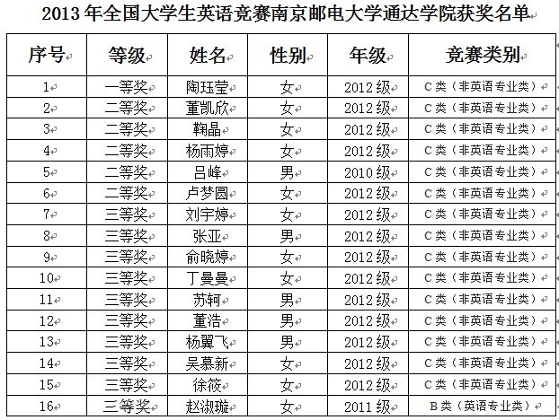 2013年全国大学生英语竞赛决赛成绩近日公布,新葡的京共获得全国一等奖1名,二等奖5名,三等奖10名。同学们取得的优异成绩体现了新葡的京学生较高的英语水平与优秀的文化语言素养。