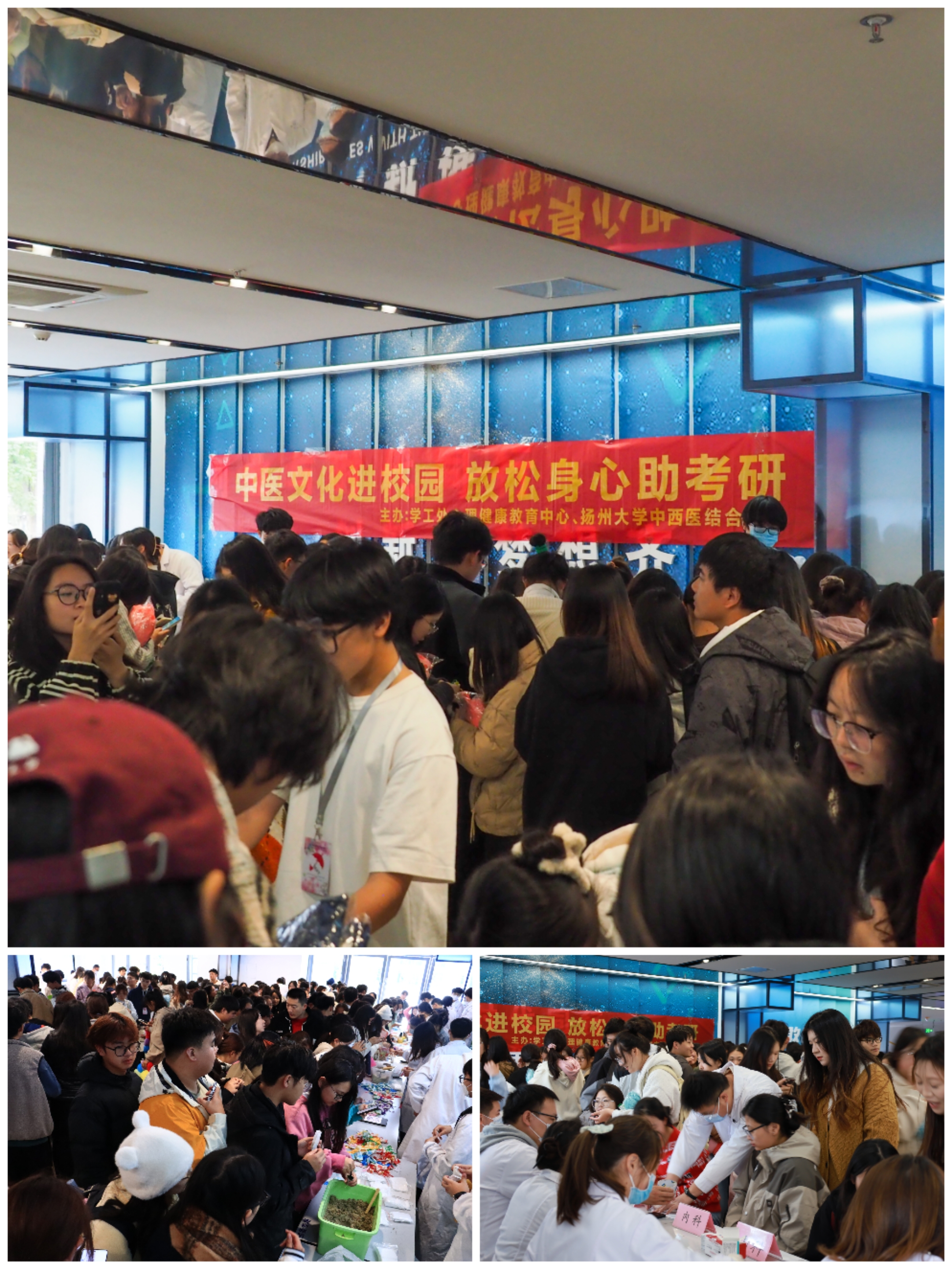 11月10日下午,新葡的京心理健康教育中心特邀扬州大学医学院三十余位师生在双创楼一楼大厅共同开展“中医文化进校园,放松身心助考研”主题活动。学生工作处负责人及千余名师生参与体验了活动。